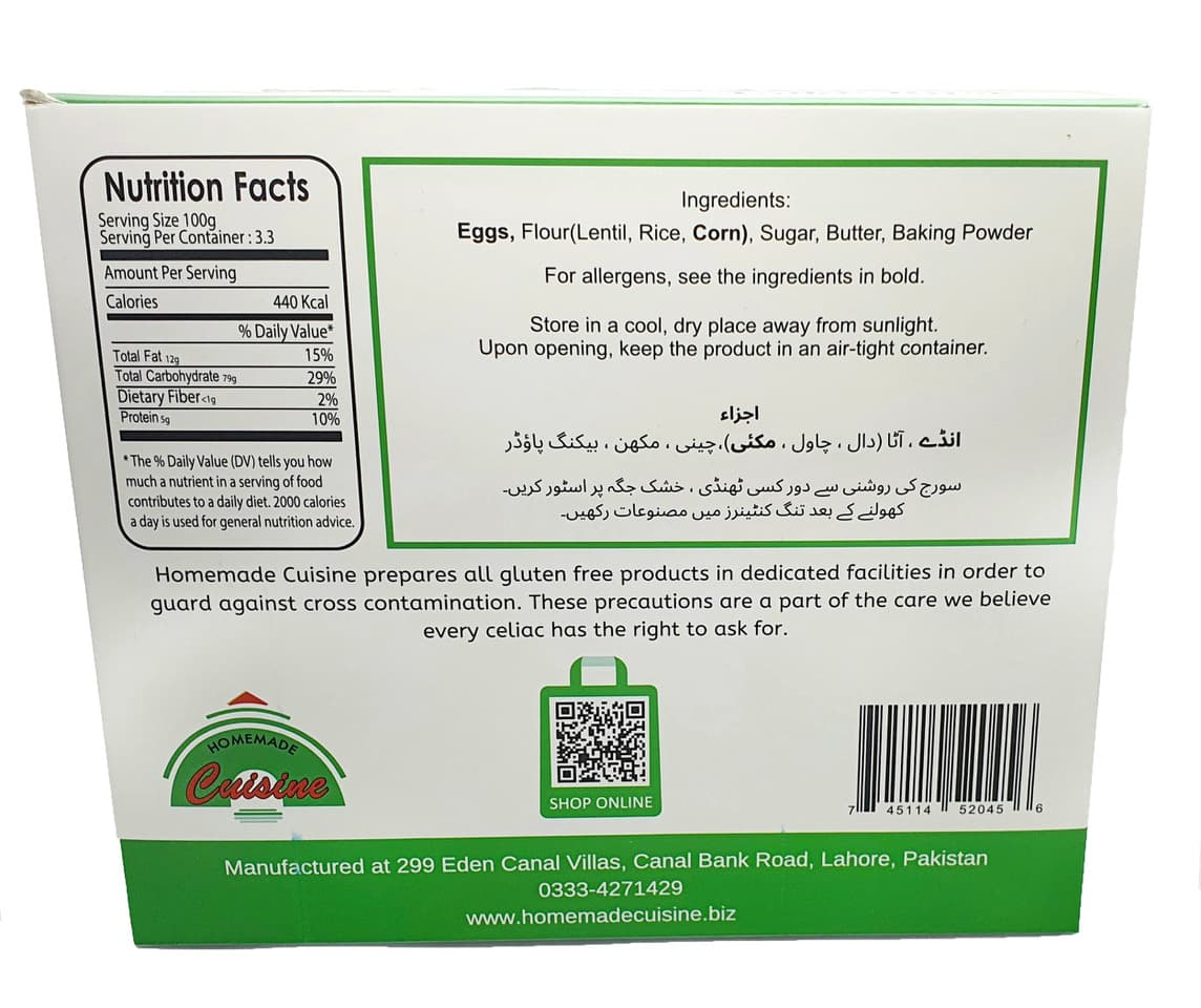 Ingredients: Ingredients: HMC Gluten Free Cake Rusk Flour (Moong Daal Flour, Rice Flour, Maize Flour, Thickener: Guar Gum E412), eggs, non-dairy & non-hydrogenated banaspati ghee (palm oil, palm olein, cottonseed oil, canola oil, soyabean oil, sunflower oil, vitamin A, vitamin D), sugar, water, baking powder (Emulsifier: Sodium Acid Pyrophosphate (E450i), Raising Agent: Sodium Bicarbonate (E500ii), Maize Starch), salt, flavourings