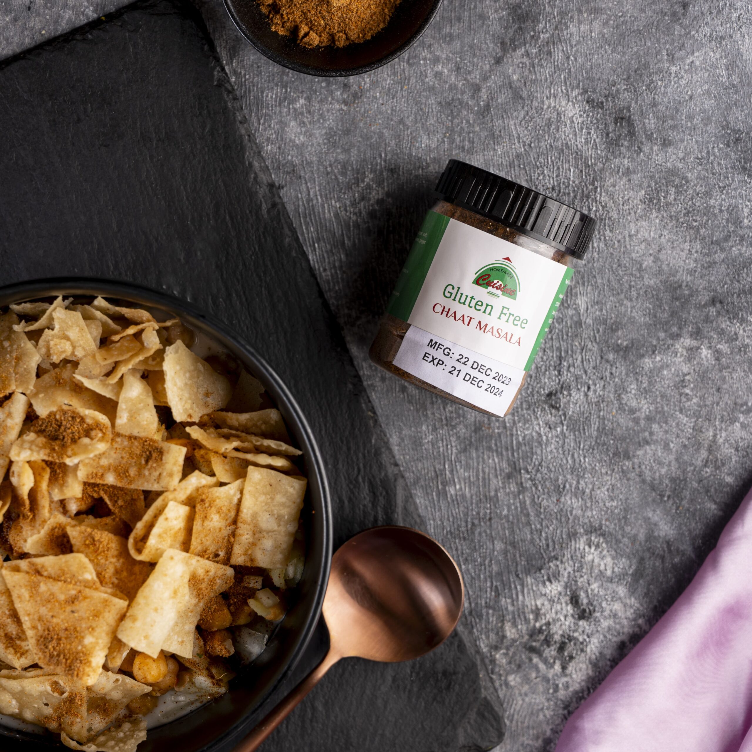 Ingredients: Black salt, cumin, red chilli, coriander, black pepper, mango powder, salt, lemon salt, carom seeds, cinnamon, ginger, citric acid